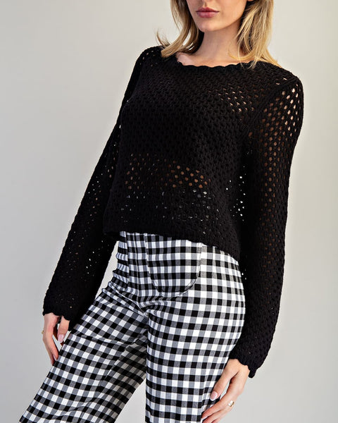• This open knit sweater showcases a breezy crochet texture with scalloped detailing along the neckline and cuffs, relaxed long sleeves, and a slightly cropped, boxy fit for an airy and effortlessly charming look.