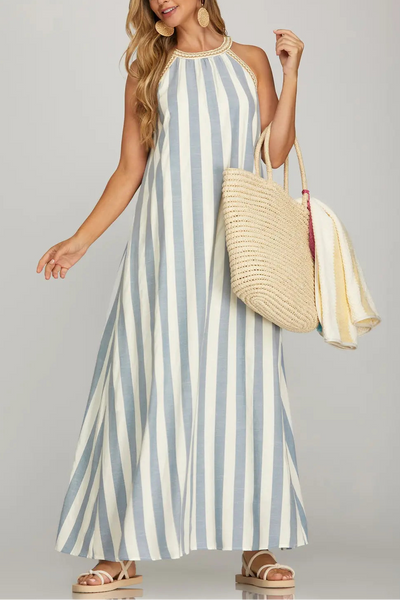• Halter Neck with Trim Stripe Woven A line Maxi Dress with pockets