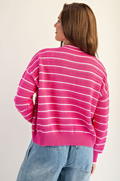 Product Detail: This cardigan features a V-neckline and textured open stitch stripe knit with a contrast ribbed placket, oversized buttons, dropped shoulders, and wide ribbed trim for a modern yet cozy finish.
